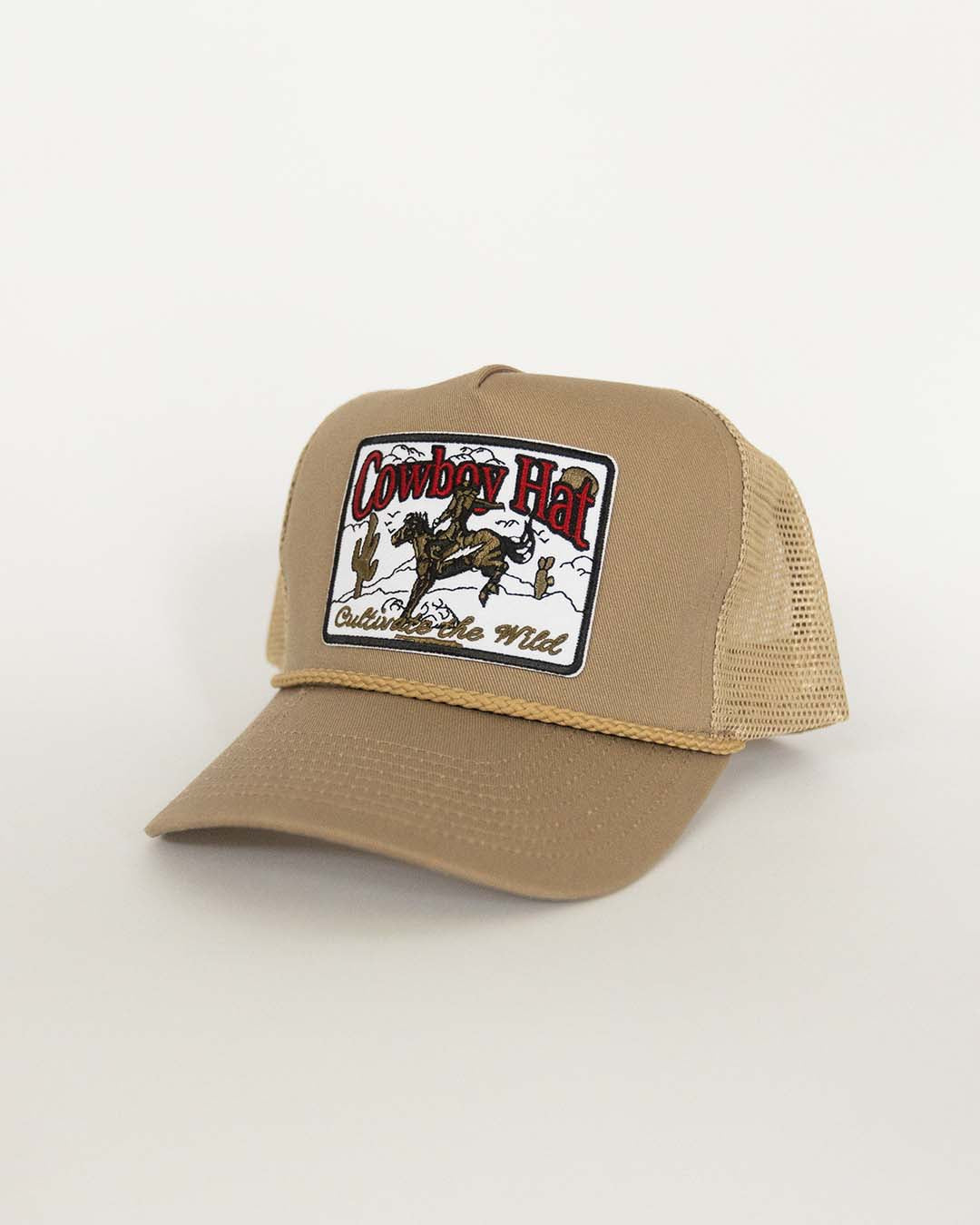 Black trucker hat featuring the "Cowboy Hat" patch with horse and "Cultivate the Wild" with a country landscape.